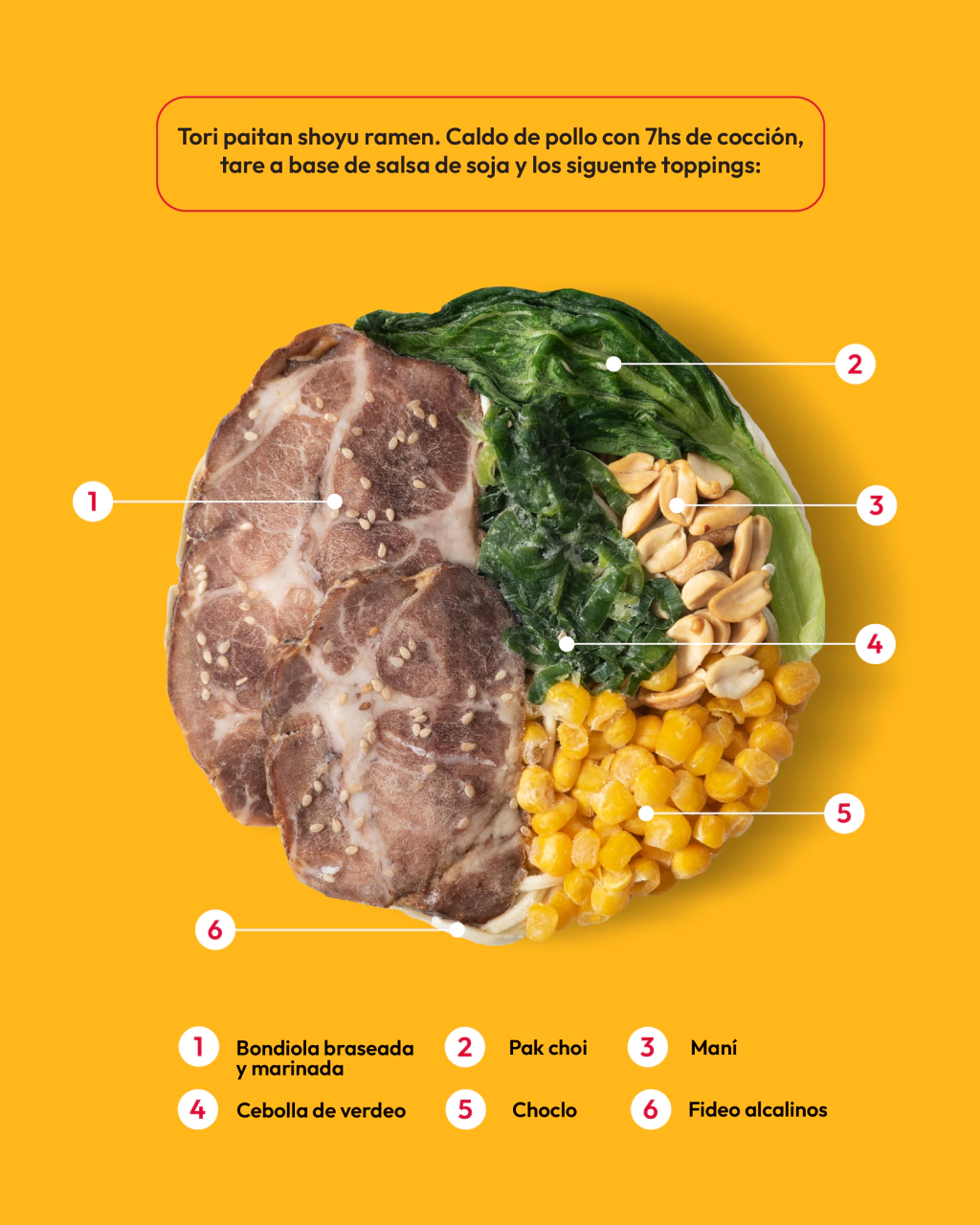 Tori paitan (caldo de pollo), shōyu tare, fideos alcalinos, chashu de bondiola de cerdo braseada, aceite aromático, choclo, pak choi, maní y cebolla de verdeo. Brix: 6%.
